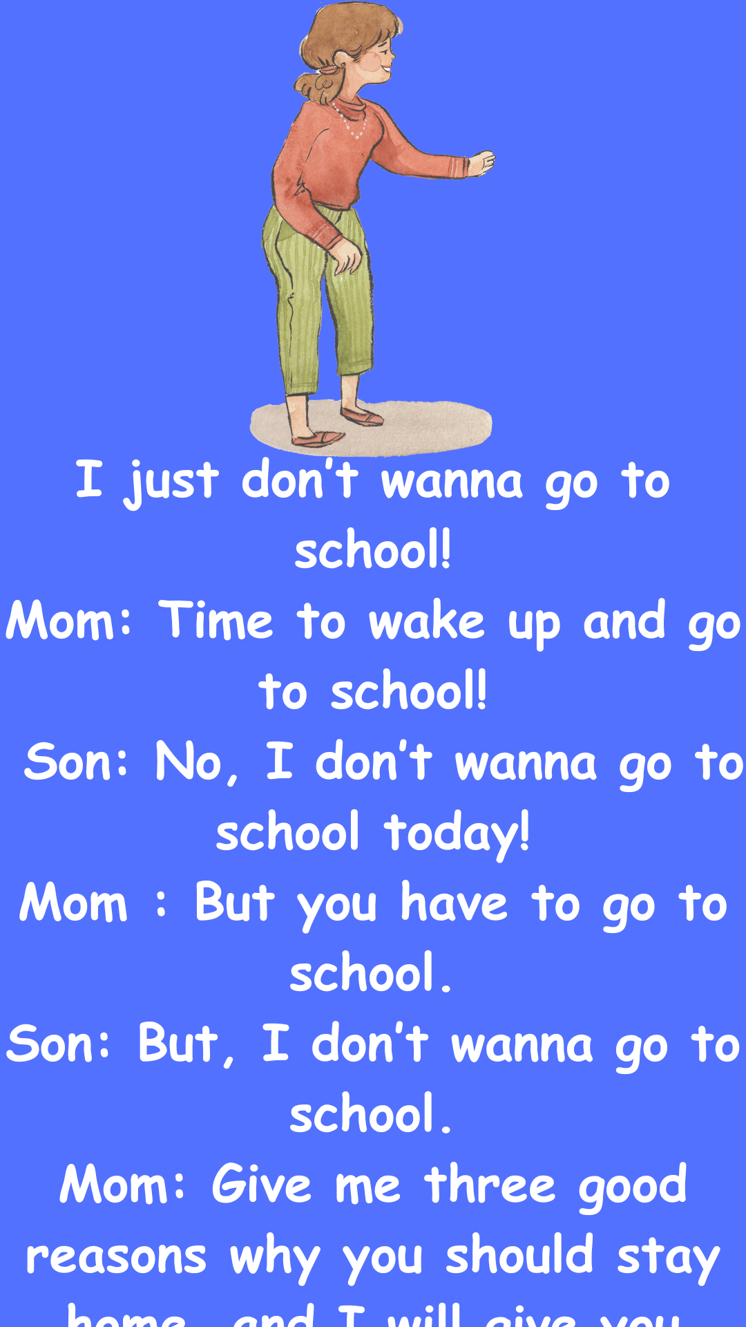 Mom: Time to wake up and go to school! Son: No, I don’t wanna go to school today! Mom : But you have to go...